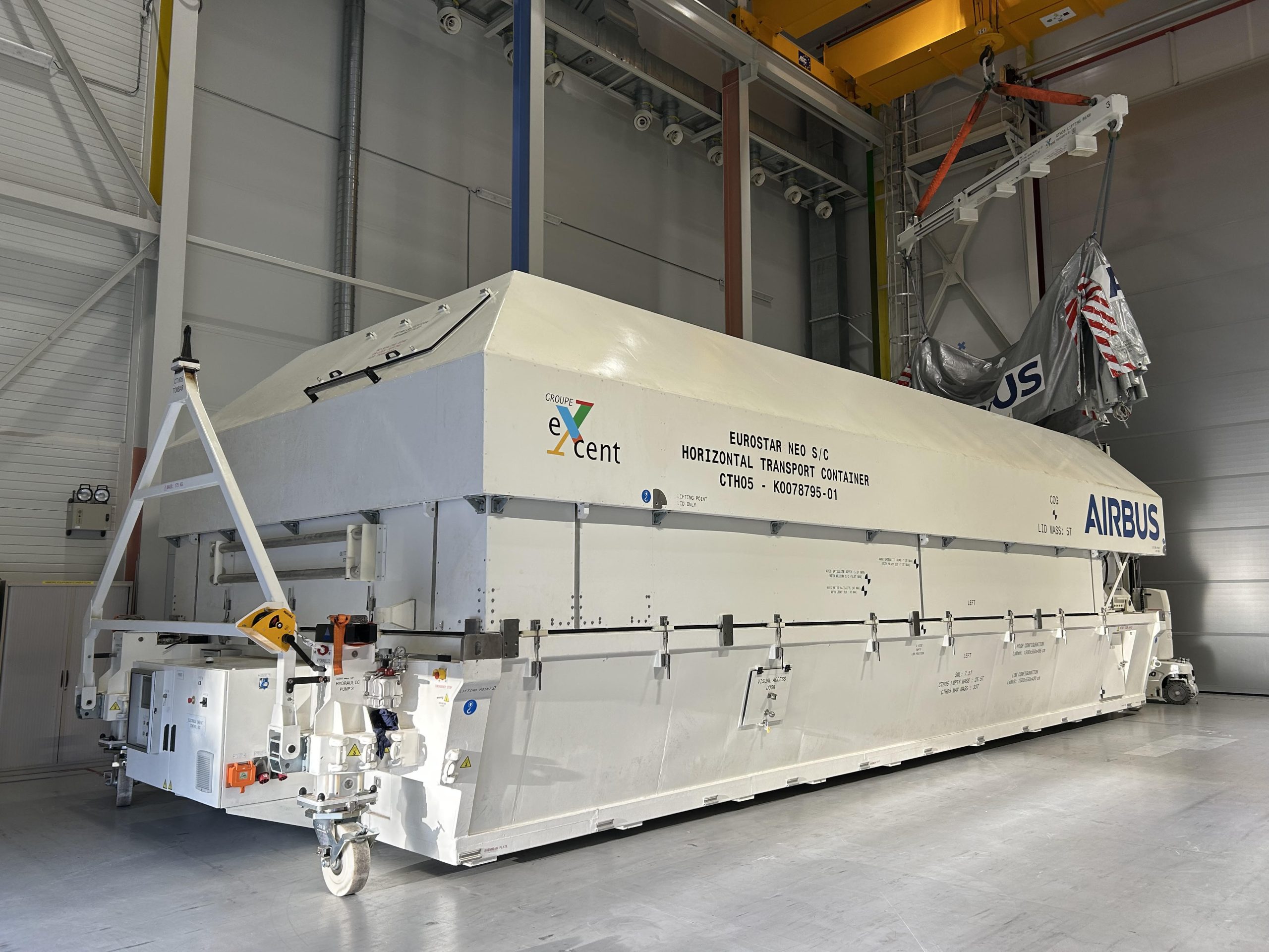 Le conteneur de 25 tonnes et de 7,5 tonnes de charge utile maximale est le fruit de 5 années de développement et de fabrication, permettant à Airbus Defence and Space de transporter soit par voie aérienne, routière, ferroviaire ou maritime ; tout engin spatial dans la large gamme [3,5 à 7,5 tonnes] de la famille d’engins spatiaux Eurostar Neo.